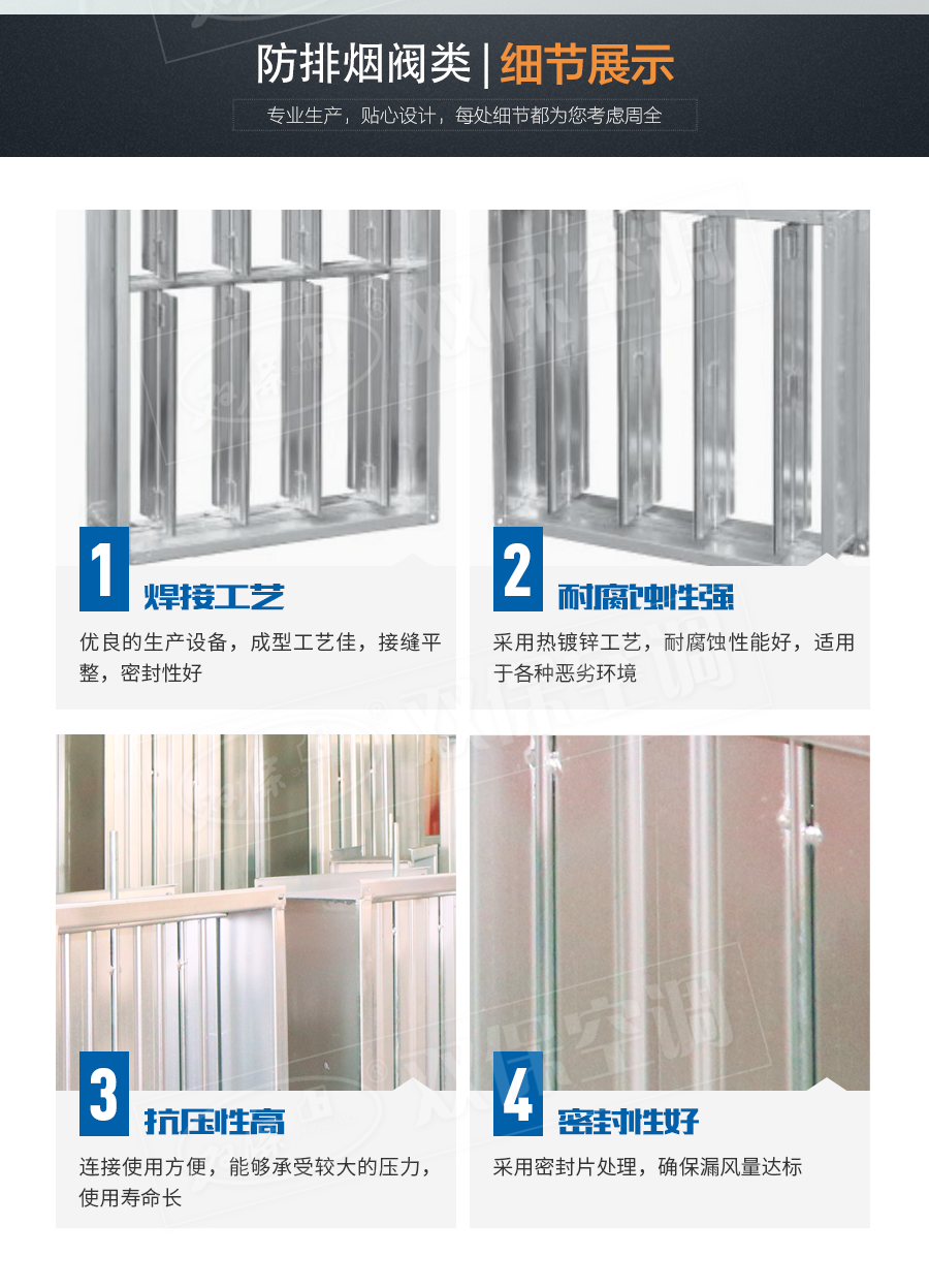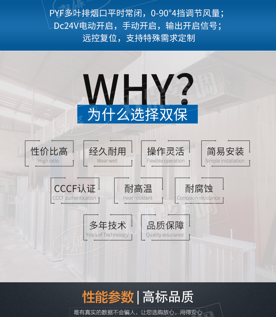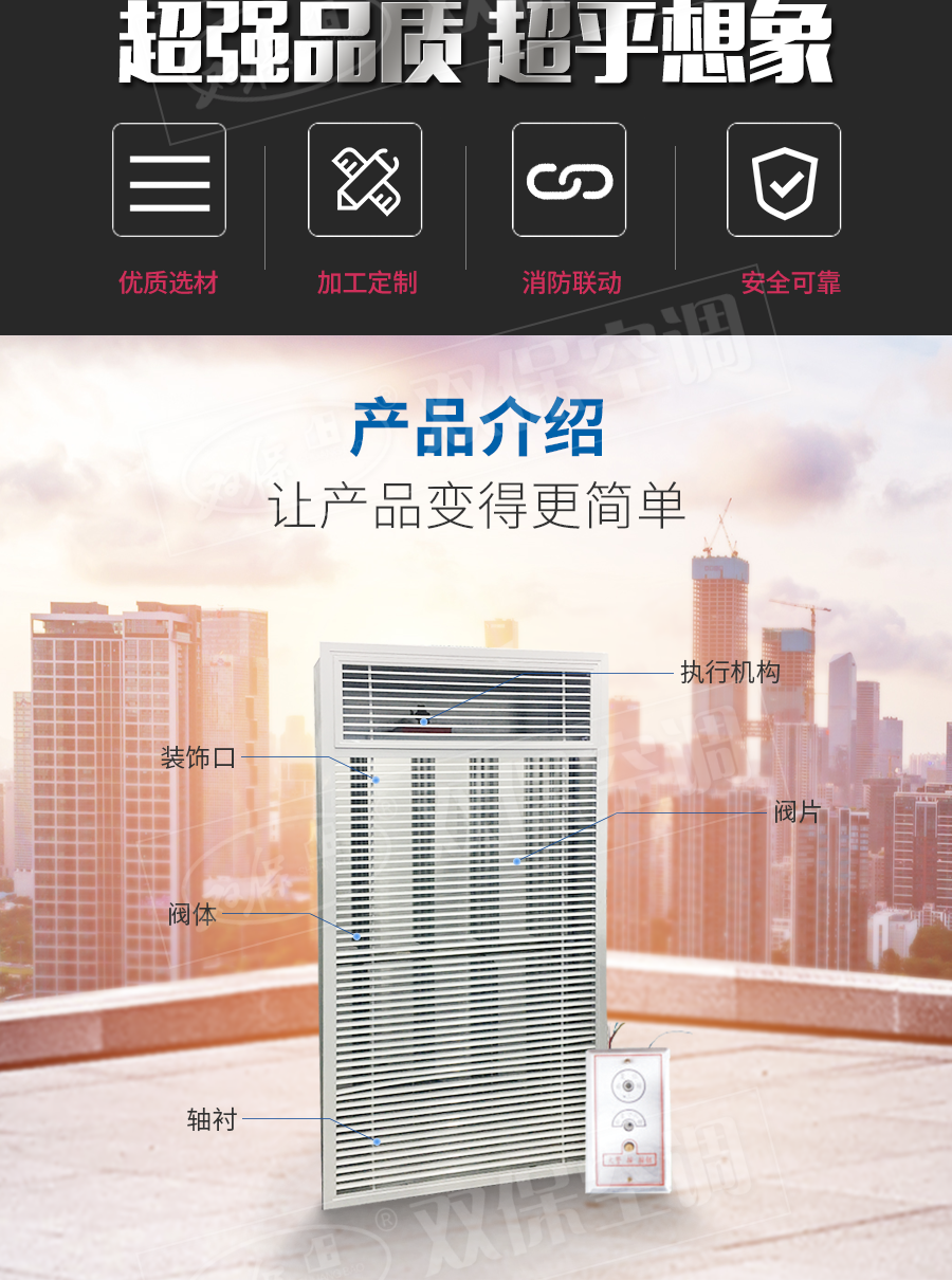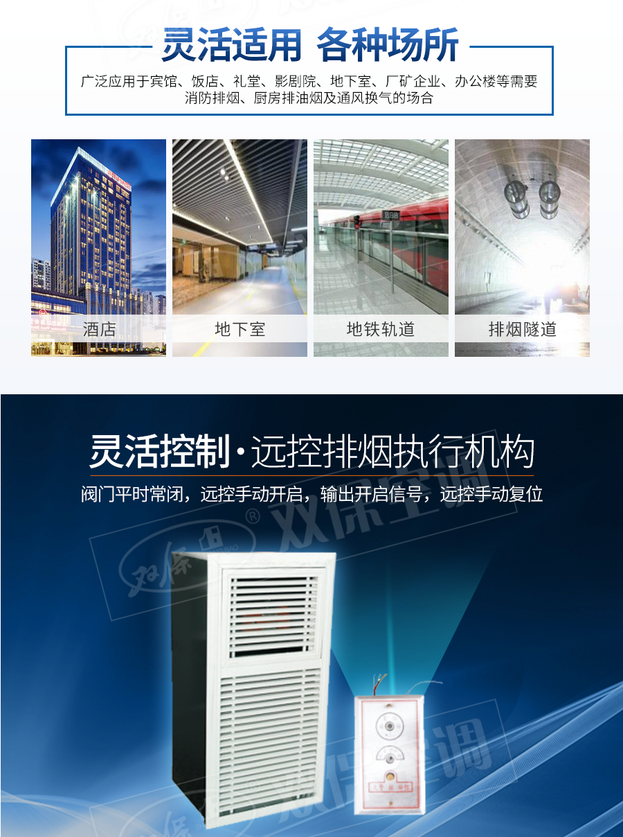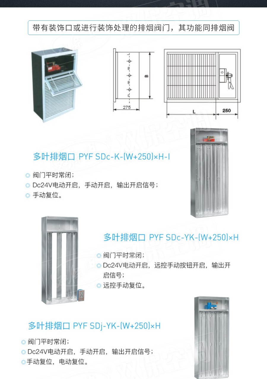 江蘇雙保空調有限公司—多葉排煙口 閥門平時常閉; Dc24V電動開啟,手動開啟,輸出開啟信號; 手動復位。