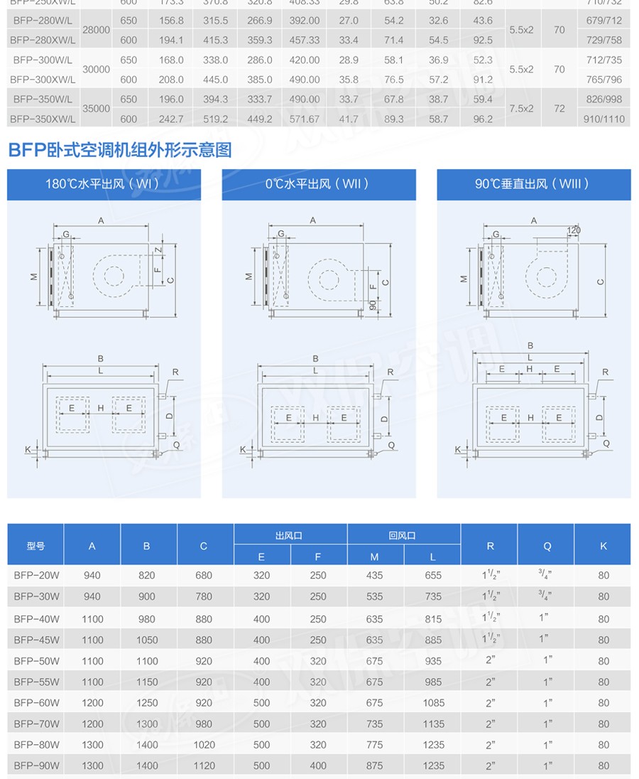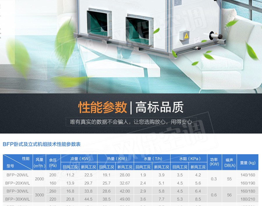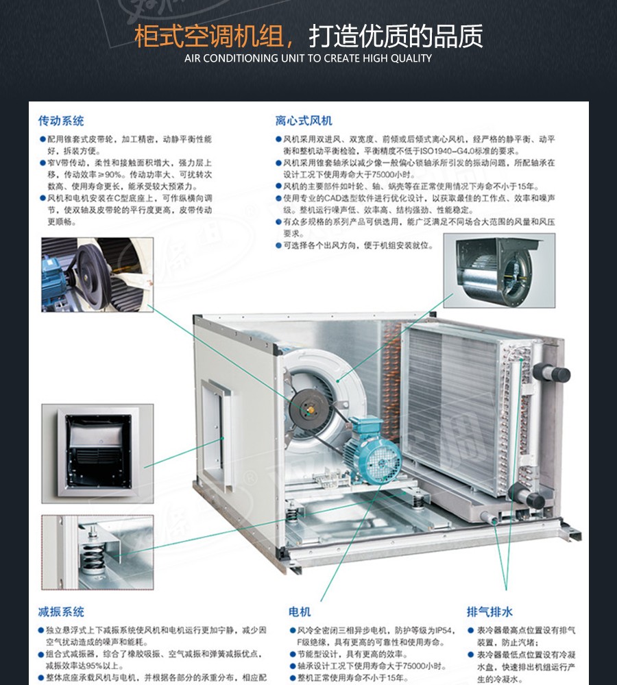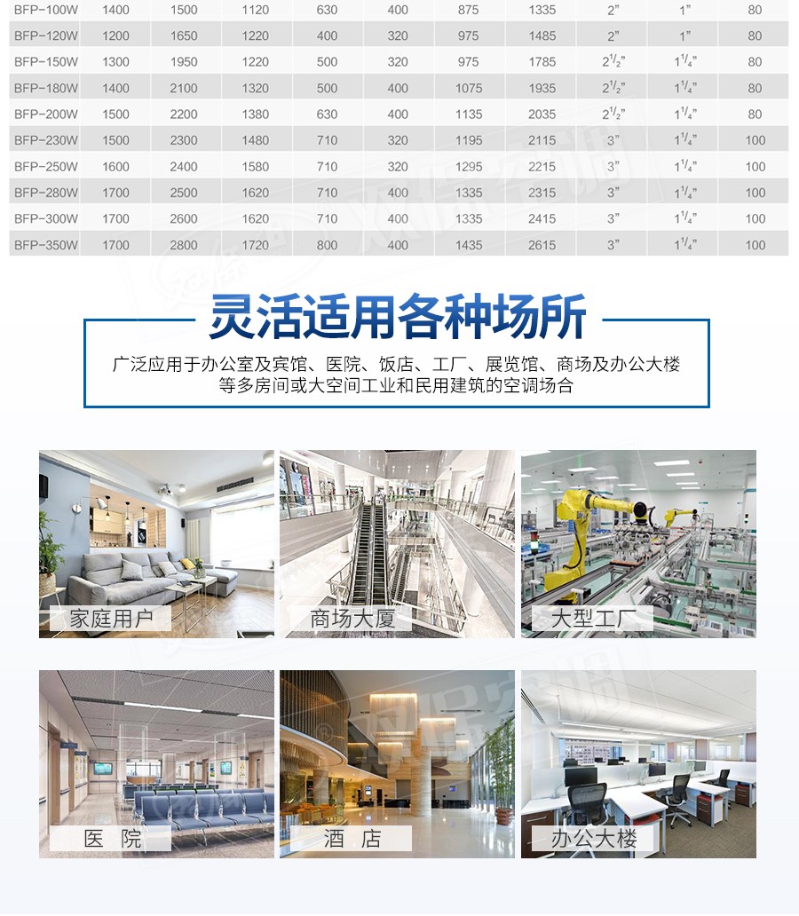 江蘇雙保空調有限公司—BFP系列柜式空調機組可實現對空氣的加熱、冷卻、加濕、過濾凈化等多種功能。廣泛應用于賓館、商場、機場、醫院、寫字樓等大中型公共建筑的舒適性空調和電子、紡織、化工、制藥、食品等行業的工藝性空調。該機組不僅具有制冷供熱性能優越、噪音低、高度薄、結構緊湊、重量輕、安裝維護方便的優點,而且還可以配上調頻或調壓變速控制器后。按四季不同工況與現場空調場合匹配進行變風量節能運行。因此特別適用于建筑物緊湊的各類空調工程場合使用。