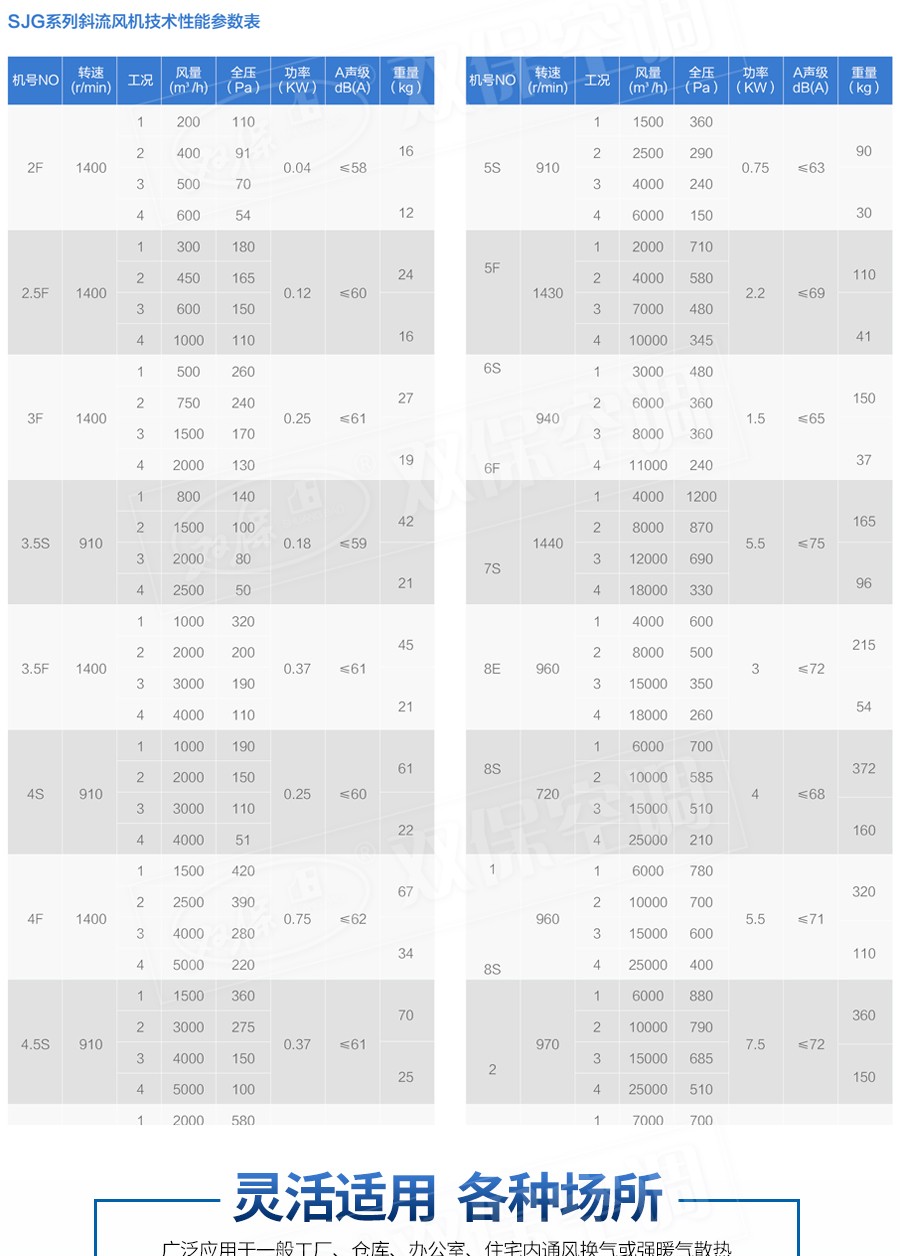 【風(fēng)機(jī)特點(diǎn)】同型號斜流風(fēng)機(jī)的風(fēng)壓較混流風(fēng)機(jī)高,該風(fēng)機(jī)最適用于直管道加壓送風(fēng)和排風(fēng)。占地少、安裝方便(水平、垂直、吊裝均可)。